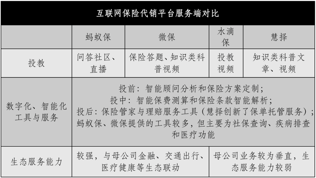 生态服务能力是蚂蚁保、微保与水滴保、慧择之间的最大差异。