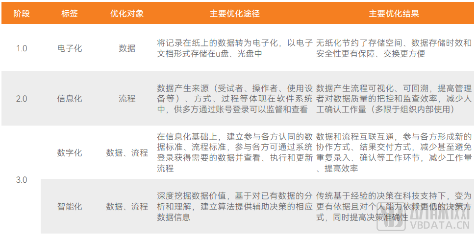 临床试验行业已完成电子化和信息化建设。2005年前后,行业开始尝试将传统记录在纸上的数据以文档形式存储,完成了电子化的建设。电子化让数据可以更安全、长效被保存,也让数据交换变得更方便,但数据的真实性和回溯性依然较差,无法满足数据准确性验证和监查的需求。