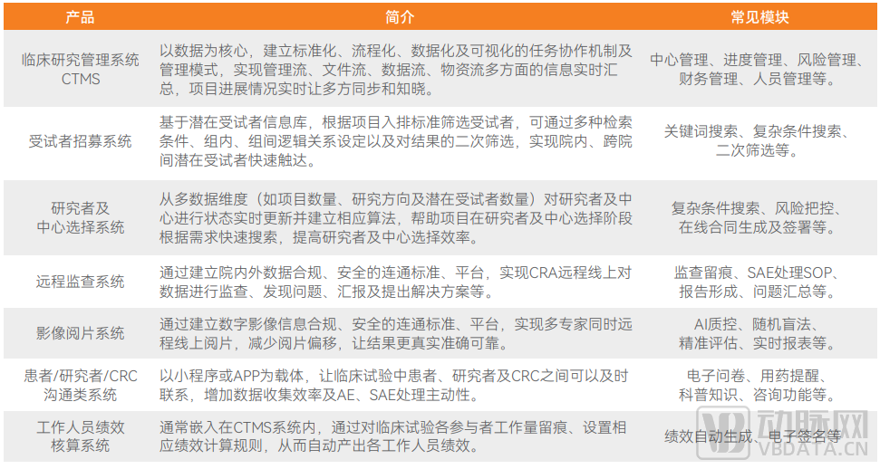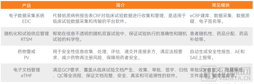 数字化产品管线不断丰富,临床试验各环节被逐步覆盖。我们盘点了目前主要的临床试验数字化产品及其主要应用环节,值得注意的是,随着各类产品的不断升级迭代,各产品出现逐步结合的趋势(互相包含),也因此,来自不同企业的同类型产品也逐步出现差异化。