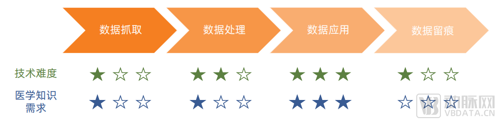 要用机器替代人工,通过接口将院内数据填写在EDC系统相应位置,需要经过数据抓取、数据处理(脱敏、归档、格式转换等)、数据应用(匹配、填写)三个环节,每个步骤的效率、准确率都与技术和医学知识及诊疗逻辑的融合程度息息相关。