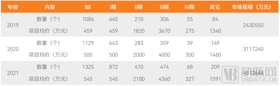 2019年到2021年期间,“值钱”的Ⅱ、Ⅲ期临床试验总数平均年增长率分别高达39.82%和24.68%,明显高于其它期。按此推算,2022年临床试验整体市场规模有望超过600亿元。
