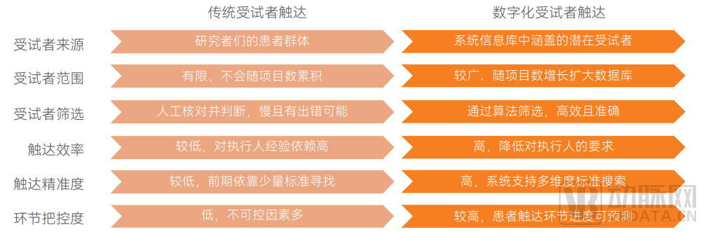 数字化重塑触达环节,提高触达潜在受试者的效率。受试者招募在临床试验的“痛点排行榜”上一直居高不下,主要关键难点之一是难以高效触达精准受试者。传统招募环节主要依赖合作研究者们的病人群体、研究者们之间的推荐、CRC到病房一一“人工搜索”等纯人工且效率和精准度都较低的方式。