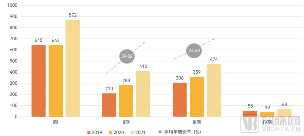 2019-2021年新药临床试中各期临床试验总数变化情况,数据来源:国家药品监督管理局药品审评中心、创新工场,蛋壳研究院制