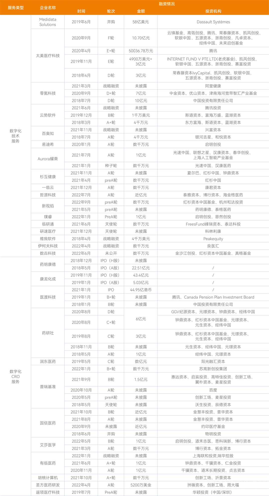 创新型数字化CRO企业展现出不错的融资表现。以“数字化”切入,提供临床试验CRO服务的企业分为以技术为基础加以服务的企业,该类企业的产品既可以是单独的技术服务也可以是整体的CRO服务;另一类是专注仅提供CRO服务的企业。