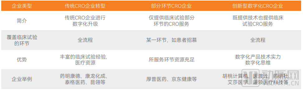 为了厘清临床试验CRO企业的发展现状,我们将能够提供数字化临床试验CRO服务的企业大致分为三类。