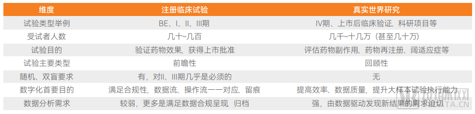 真实世界研究对降本增效的需求更迫切。RWS与注册临床试验在法规要求、方案设计、受试者数要求及数据收集维度等差异较大,故较注册临床试验,RWS的数字化进程和需求也有所不同。