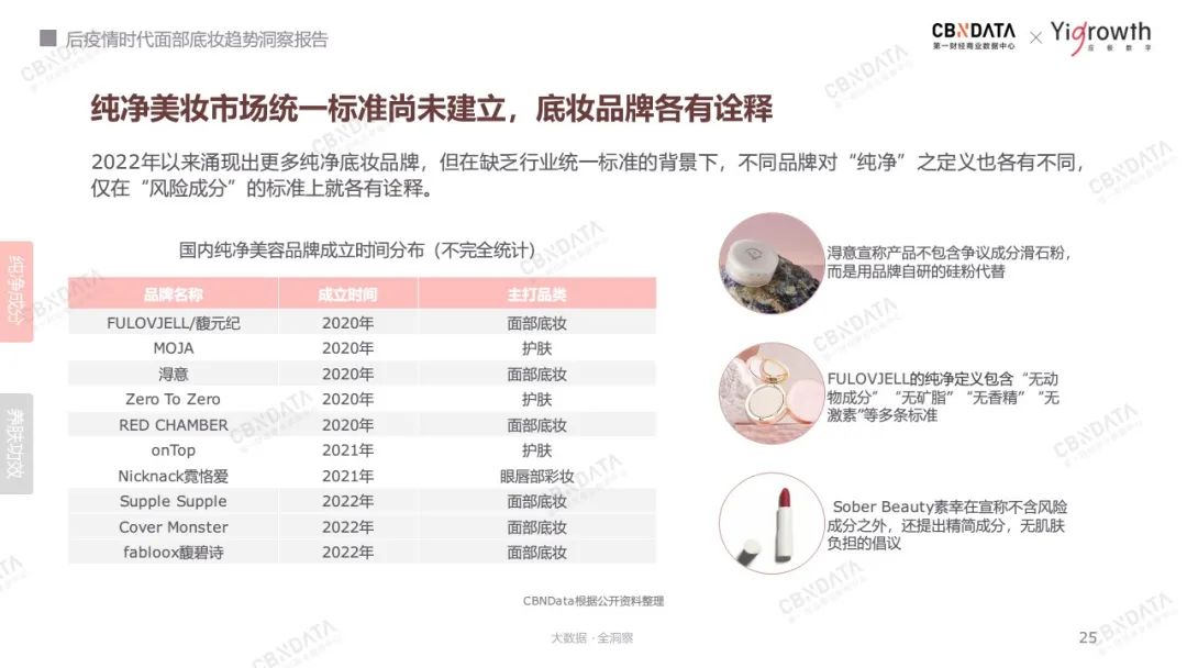 以主打纯净的底妆品牌为例,由于以粉底为代表的底妆产品是水乳为代表的护肤品以外,在皮肤上停留时间最久的品类,消费者对产品有更高的健康和安全需求——此为纯净底妆崛起的消费者因素。