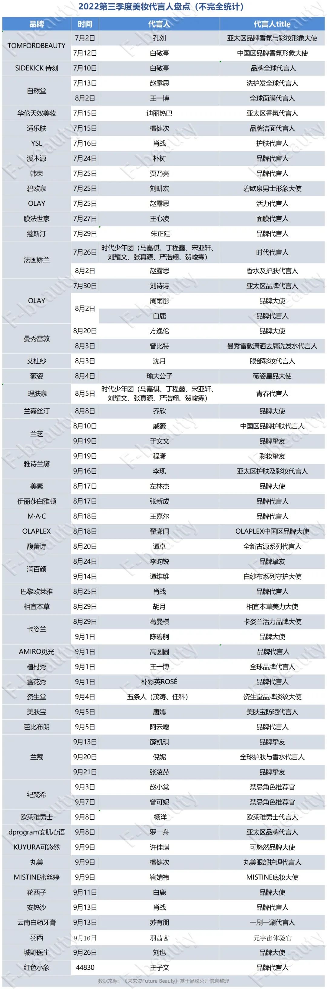 据不完全统计,2022年第三季度,已经有49个美妆品牌陆续官宣了60位代言人。官宣新代言的品牌和代言人总数相比第一季度分别下滑17%和14%。