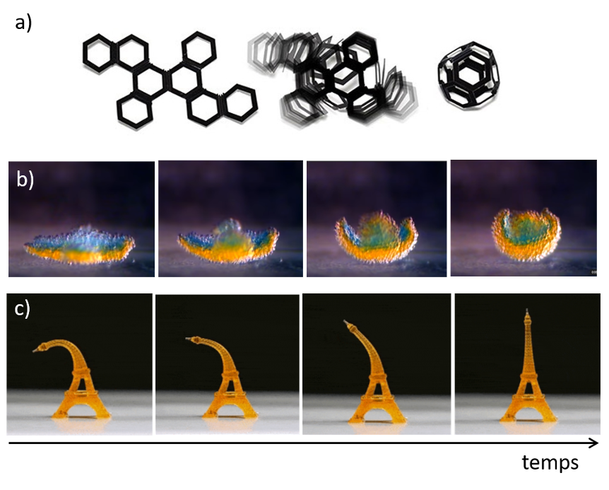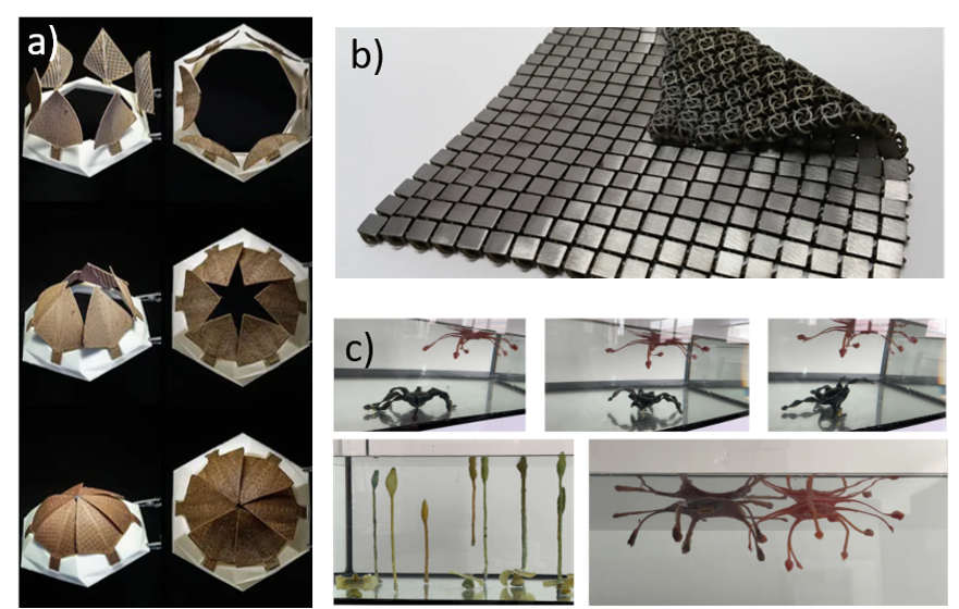 c) 利用形状记忆高分子材料和4D打印制作的“温度敏感埃菲尔塔”模型,图源Scientific Reports 期刊[6]