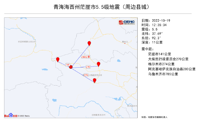 据中国地震台网正式测定:10月19日12时35分在青海海西州茫崖市(北纬37.69度,东经92.30度)发生5.5级地震,震源深度11千米。