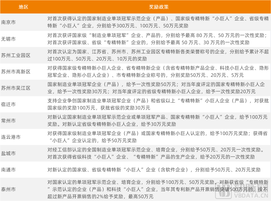针对成功认定的国家级和省级专精特新企业,江苏省各地区制定了针对性的奖励措施。