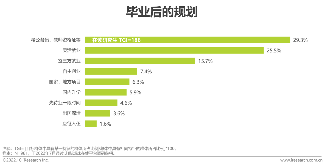 研究生群体对公务员、事业单位等体制内工作的倾向尤为明显。在读研究生中,54.5%受访者的职业规划为进入体制内。