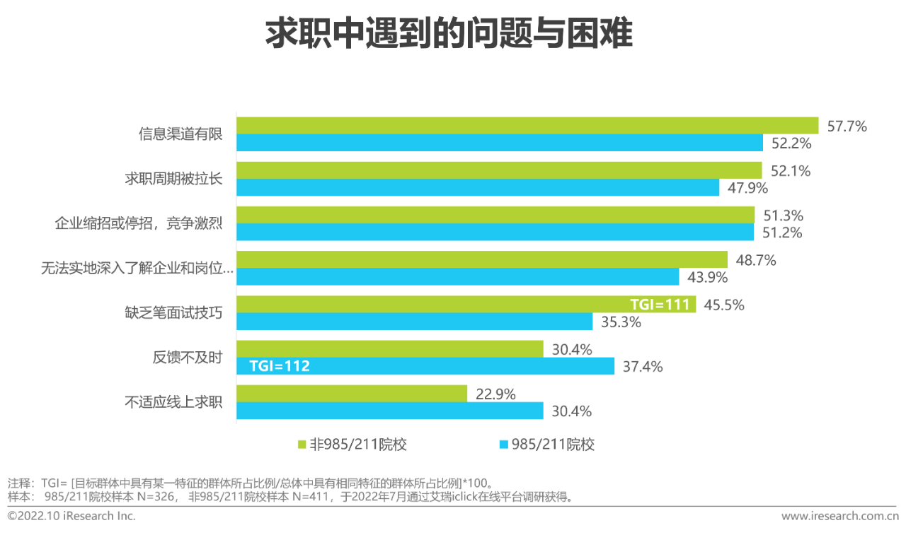 985/211院校的学生在求职过程中,投递简历或笔面试后反馈不及时的问题更加突出,而非985/211院校的学生们遇到的问题集中在缺乏笔面试技巧上。