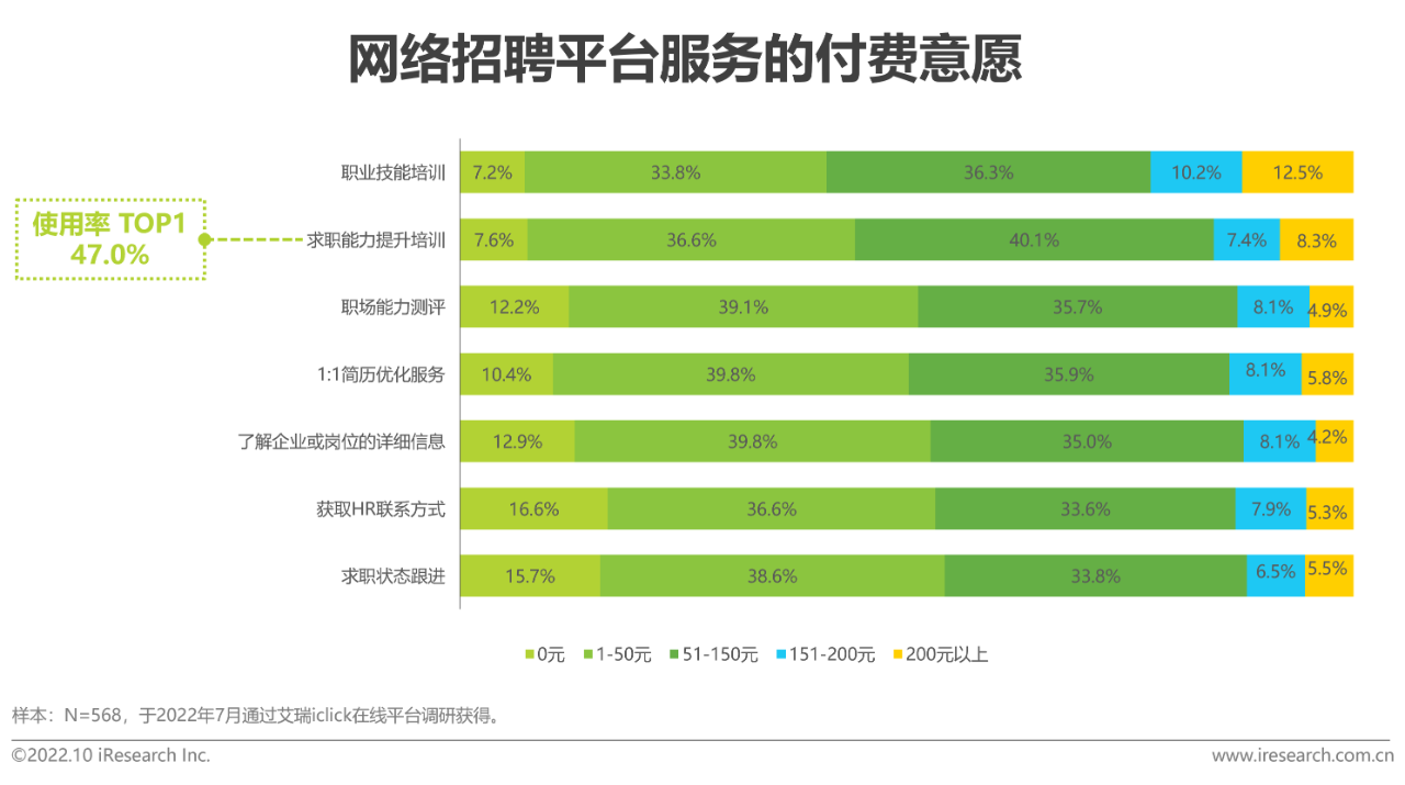 从付费意愿来看,学生对于职业技能培训及求职能力提升培训服务的付费意愿最强,愿意为单次服务付费超100元的比例分别达到33.8%和27%。
