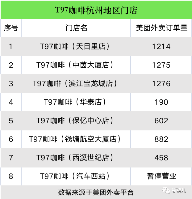 其次,新腕梳理了T97杭州大本营的开店情况。这8家店中有一家尚未营业,我们可以从这些门店销售数据来看是否真是李潇所讲的“平均每天150杯以上”。