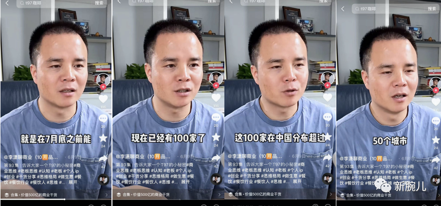 借着T97咖啡项目风口,李潇正忙着在抖音打造“创业教父”形象。他每天要在抖音账号发布《未来创业的3大方向》、《创业要先搞懂人性》、《35岁之后你才能赚大钱》等成功学视频,讲自己当年的创业故事,如何做到百亿级营收,让大家觉得跟着他就可以走上人生巅峰。