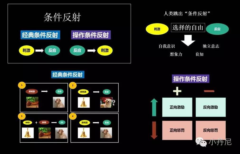 现在我们知道了“经典条件反射”是先有刺激,后有反应;“操作条件反射”是先有反应,后有刺激。