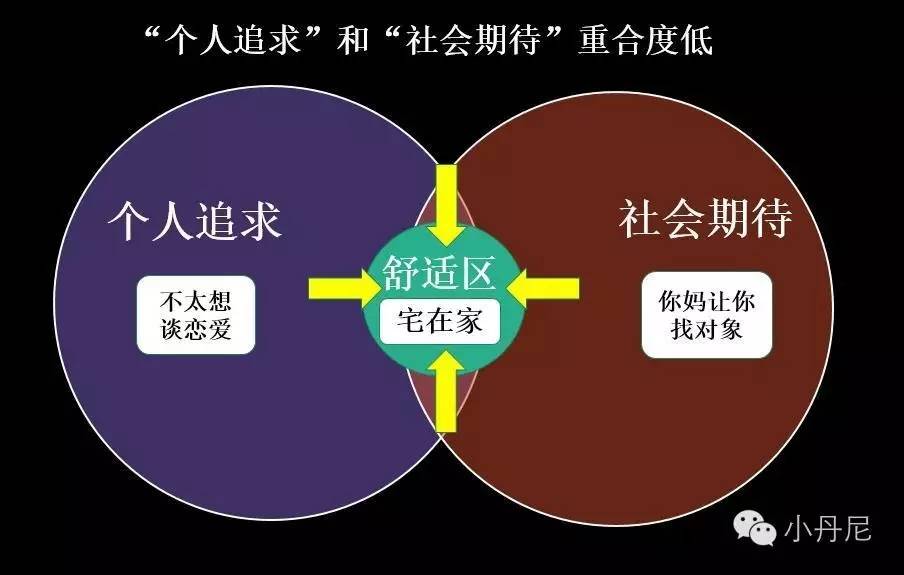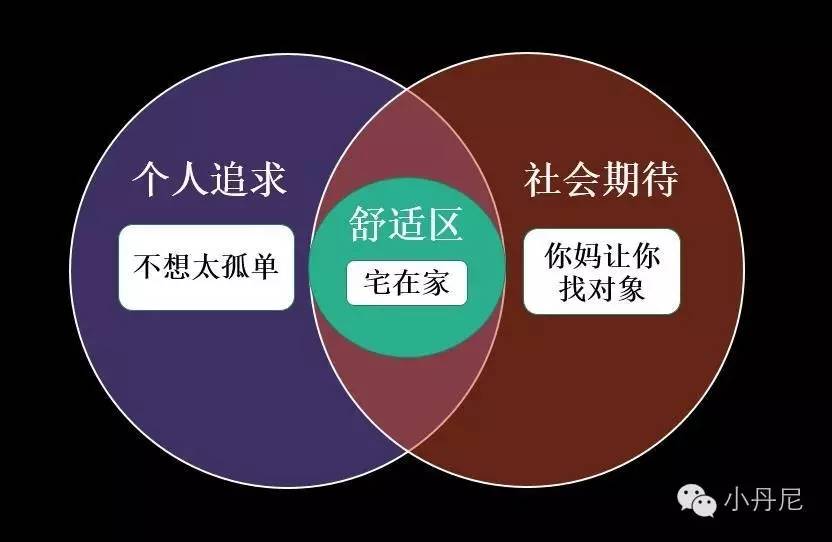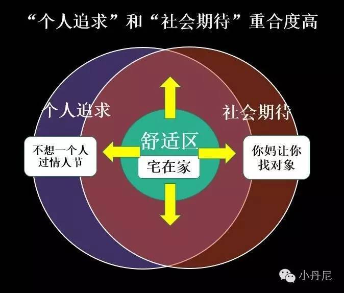 比如你的“个人追求”是“不想一个人过情人节”,你的“社会期待”还是“你妈希望你赶紧找对象”,你的“个人追求”和“社会期待”重合度高,那么你跳出“宅在家”舒适区的动力就会增加。