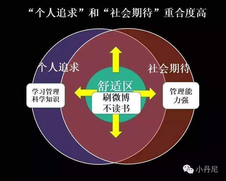 如果你是一个管理者,你要跳出的舒适区就是“刷微博不读书”,你的“个人追求”是“学习管理科学知识”,你的“社会期待”是“管理能力强”,那么你的“个人追求”和“社会期待”重合度高,你就更容易跳出“舒适区”:少刷微博多读书。