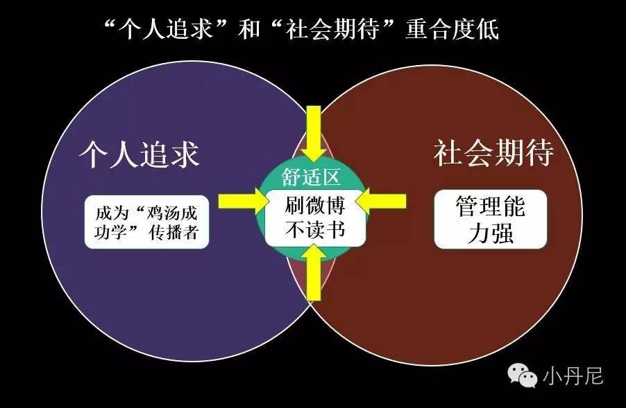 但是还有一种可能,你被网上广泛传播的“鸡汤成功学”洗脑,“个人追求”被安利变为“成为‘鸡汤成功学’传播者”,但是你的“社会期待”还是“管理能力强”,那么你的“个人追求”和“社会期待”重合度低,你就更难跳出“舒适区”:越来越爱“刷微博不读书”。