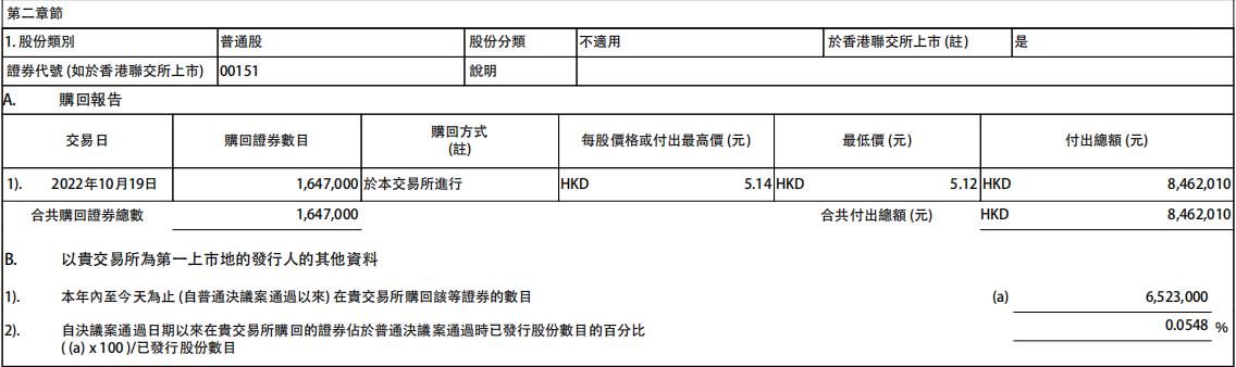 中国旺旺10月19日发布公告,公司10月19日耗资846.2万港元回购164.7万股公司股份,回购价格每股5.12-5.14港元。
