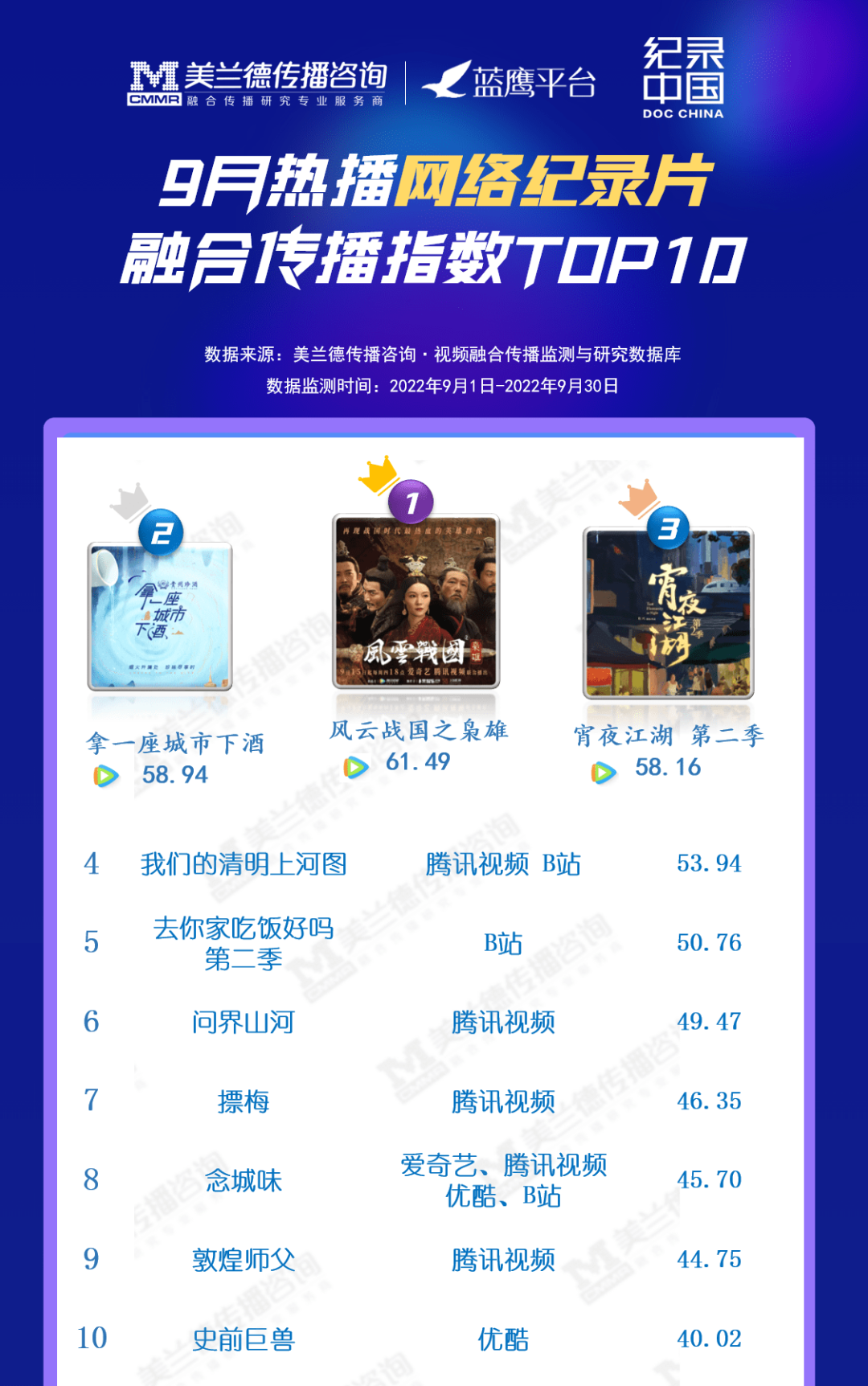 “人间烟火气,最暖凡人心。” 当下,越来越多的年轻人选择将美食纪录片作为电子榨菜。在9月热播网络纪录片融合传播指数榜TOP10中,《拿一座城市下酒》《宵夜江湖2》《去你家吃饭好吗2》《念城味》等美食纪录片位列其中,行业地位可见一斑。