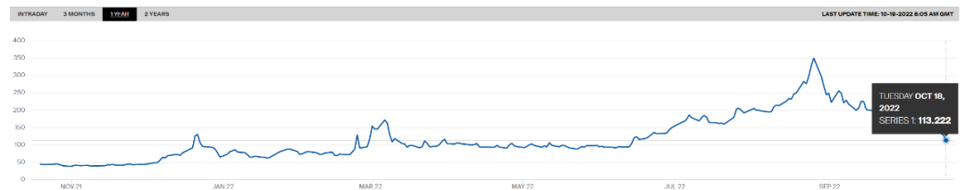 上图为近一年来荷兰TTF天然气价格的走势,可以看出,自今年8月下旬的高点之后,该指数一直呈现出震荡下挫走势。但目前的价格仍比去年同期高出一倍以上,较往年的平均水平更是高出近十倍。这也就是说,欧洲的能源危机仍然存在,远没有到警报解除的时候。