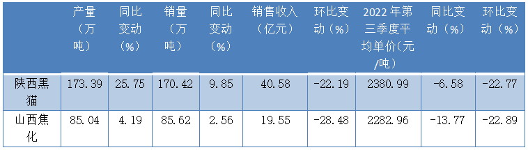 10月18日,山西焦化(600740.SH)、陕西黑猫(601015.SH)披露了第三季度主要经营数据报告,两家公司第三季度焦炭平均售价均环比下滑22%以上。其中,山西焦化第三季度焦炭产销量均环比减少7%以上,陕西黑猫则有小幅增长,两家公司产销量同比均有所增长。