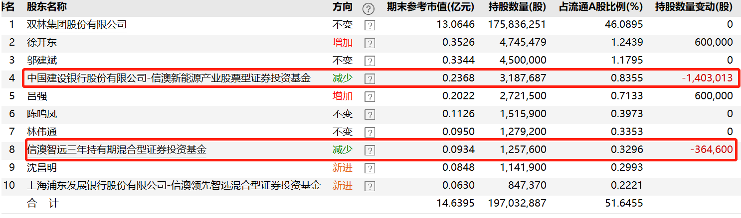 双林股份(300100.SZ)三季报显示,信澳新能源产业、信澳智远三年持有、信澳领先智选混合三只基金均由冯明远管理。三季报数据显示,信澳新能源产业、信澳智远三年持有两只基金分别减持了140万股、36.46万股,而信澳领先智选混合则在三季度新进成为前十大流通股东。