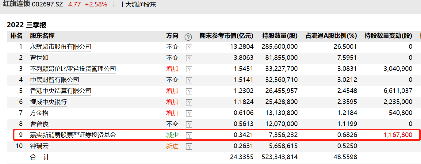 昨日下午,红旗连锁(002697.SZ)披露的三季报显示,嘉实新消费在三季度减持了116.78万股,截至三季度末仍持有735.62万股,位列第九大流通股东。而在中报中出现的嘉实沪港深精选则已经消失在三季度的十大股东名单中消失,保守估计至少减持了253万股。