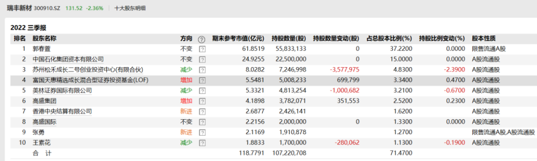 瑞丰新材(300910.SZ)10月18日晚公布的三季报显示,朱少醒管理的富国天惠精选成长混合基金在前十大股东名单中现身,位列第四大股东。