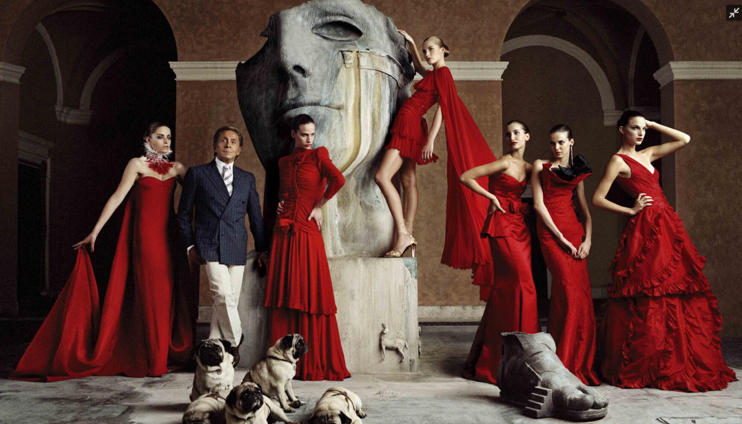 此后Valentino Garavani以各式的红色礼服立足于高级时装界,这种标志性的红色被称为Rosso Valentino,由100%的洋红、100%的黄色和10%的黑色混合而成。许多杰出女性都曾穿过Valentino Garavani设计的红裙子,比如前美国第一夫人杰奎琳·肯尼迪、戴安娜王妃,影星Elizabeth Taylor、Julia Roberts、Elizabeth Hurley、Penelope Cruz等。