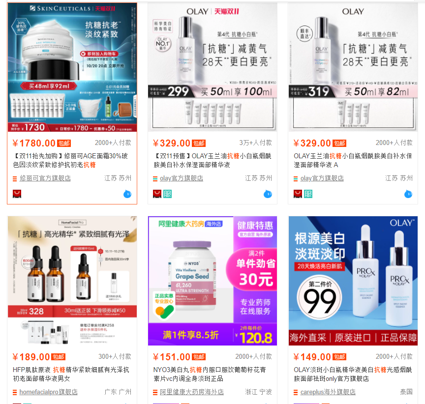 化妆品观察搜索各大电商平台发现,宣称“抗糖”的化妆品琳琅满目。以天猫为例,以“抗糖”为关键词进行搜索,显示共有近万件产品,产品品类包括了精华、面膜、面霜等,玉兰油、修丽可、HFP等众多国内外知名品牌都推出了宣称“抗糖”的产品。