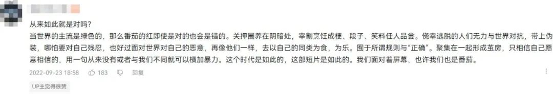 也有网友把番茄人比喻为被网暴的群体,因为无法随大流,只能“伪装自己”,屏幕前的我们固然一开始都不想从众,然而最终都放弃了自己番茄人的身份,而选择成为“人”。