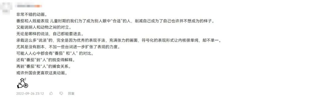 有网友站在制作角度评价该片:符号化的表现形式让内核很单纯,却不单一。