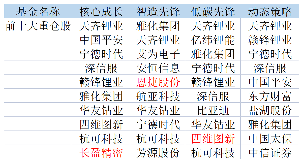 从持仓来看,四只基金在三季度的股票仓位均在90%以上。从基金的前十大重仓股来看,每只基金最多只有一只个股变动。