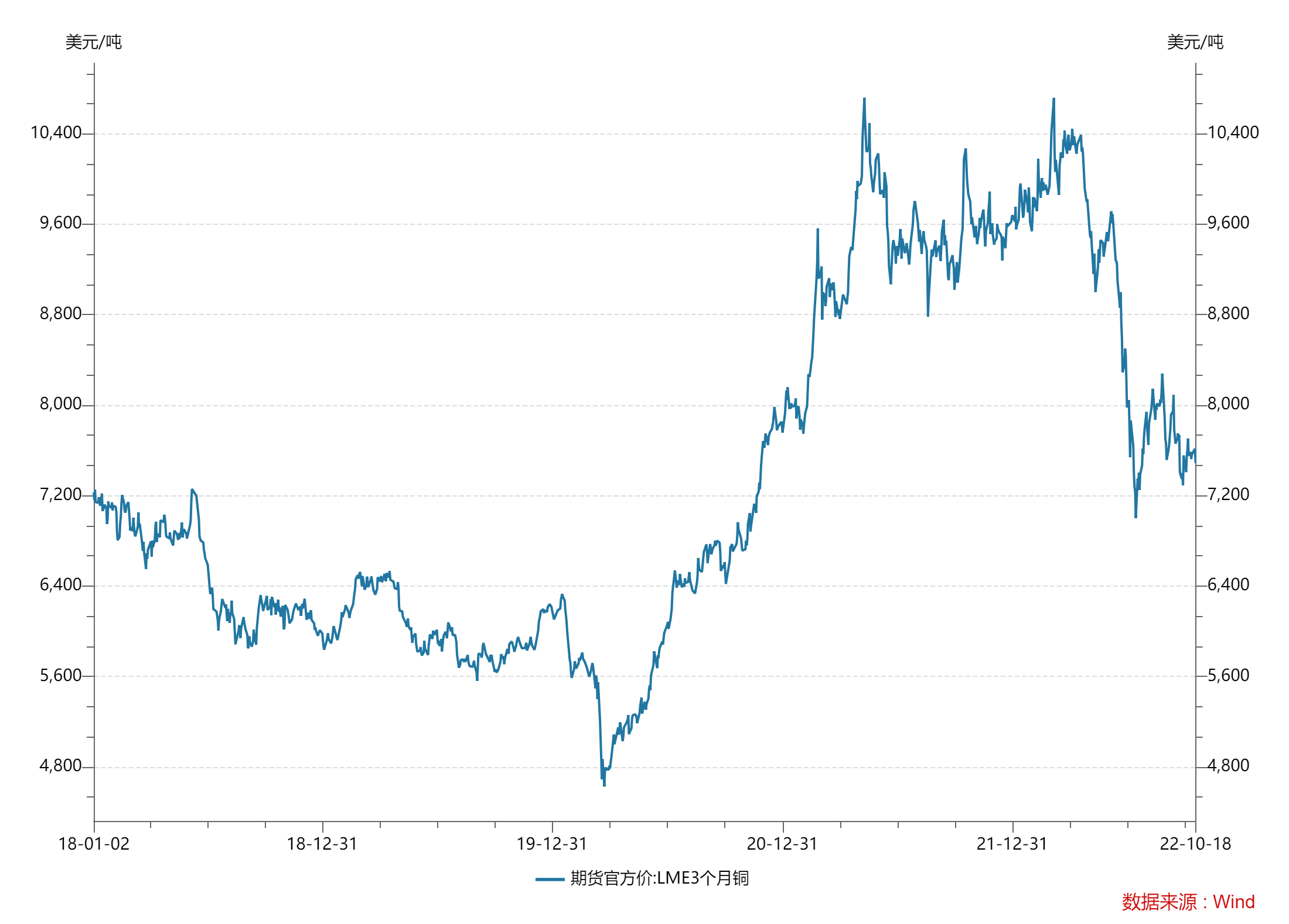 值得注意的是,今年第二季度以来,受美联储不断加息以及美国国内高通胀等因素影响,铜价和金价大幅下挫。截至10月18日,LME 3个月铜期货官方价已下跌至7489美元/吨,相较年初的9625美元/吨下滑22.19%。同期伦敦现货黄金价格为1653美元/盎司,相较年初的1811.4美元/盎司下滑8.74%。