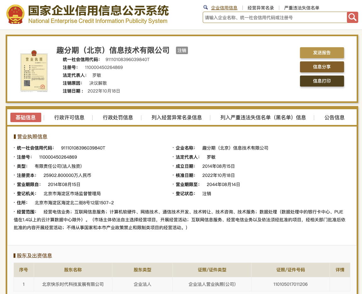 国家企业信用信息公示系统网站显示,10月18日,趣分期(北京)信息技术有限公司经营状态变更为注销,注销原因为决议解散。该公司成立于2014年8月15日,注册资本约2.59亿元人民币,法定代表人为罗敏,经营范围包含:电信业务;互联网信息服务;计算机软硬件、网络技术、通信技术开发等,由趣店关联公司北京快乐时代科技发展有限公司全资持股。