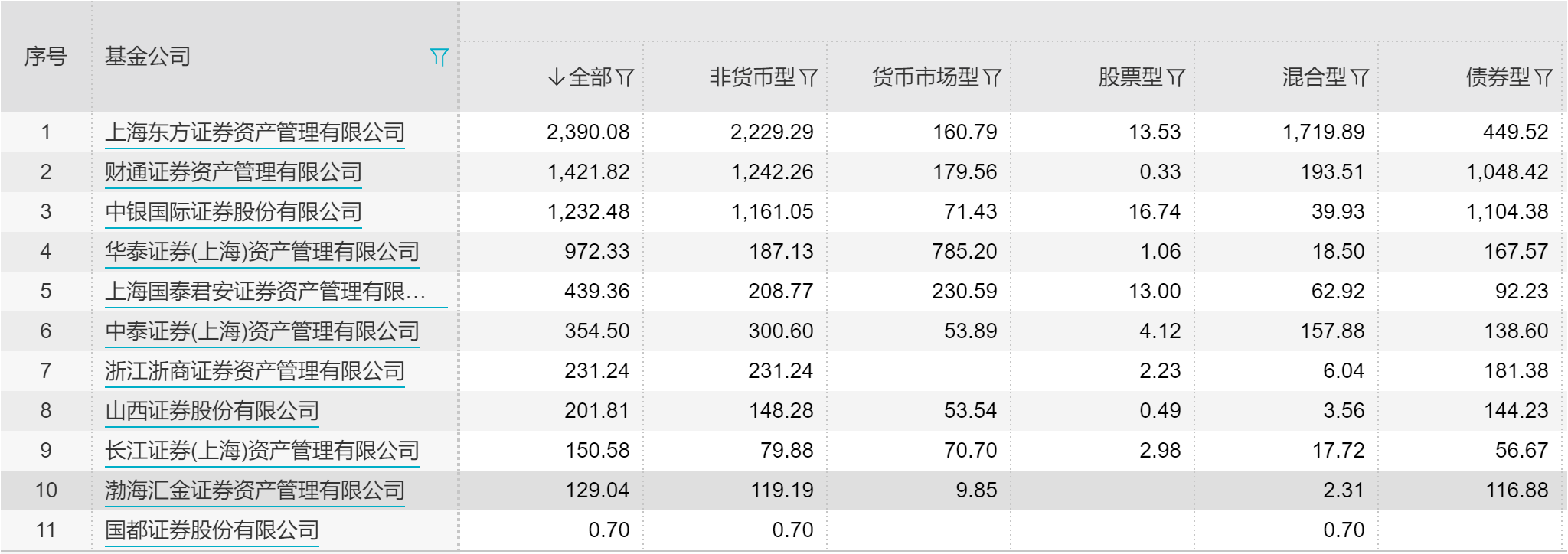 Wind数据显示,截至今年二季度末,在持有公募牌照的11家券商及券商资管子公司中,渤海汇金位列第10,公募基金规模达129.04亿元,以债基为主,债券型、货币市场型、混合型基金分别有116.88亿元、9.85亿元、2.31亿元。