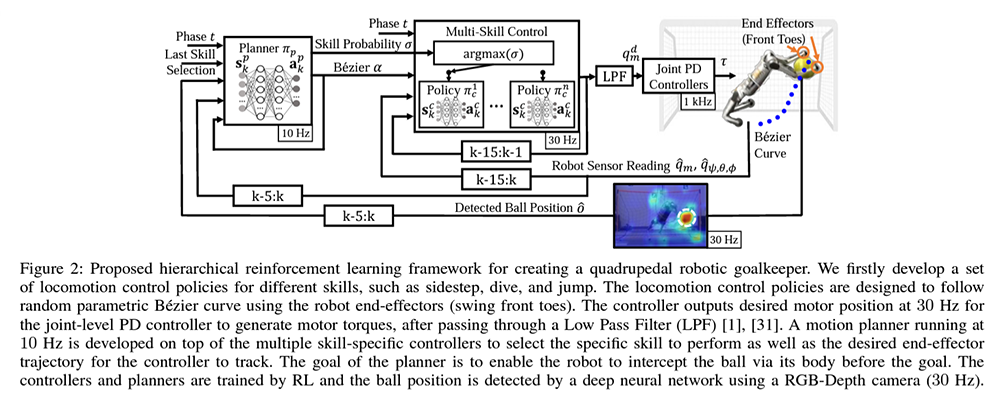 分层次的强化学习框架可以直接将四足机器人在模拟中学习到的动态动作和守门员的技能转移到现实中的四足机器人上,实验中的四足机器人对随机射门的成功拦截率为87.5%,而人类足球运动员的平均成功率为69%。