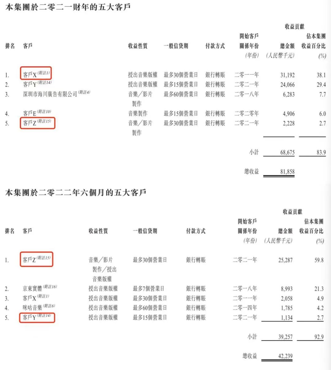但硬糖君发现,这些客户的金额也在逐年降低。客户X在2020年从4804万的收入贡献,到2022年上半年仅有205万。根据招股书对客户X的描述,纽交所上市集团,经营线上音乐平台,大概率就是TME。