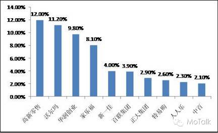 从数据上我们可以看到,中国前20家零售商只占城市零售总额的13%左右。而截止2010年,中国最大的零售商高鑫零售仅占12%的市场份额。