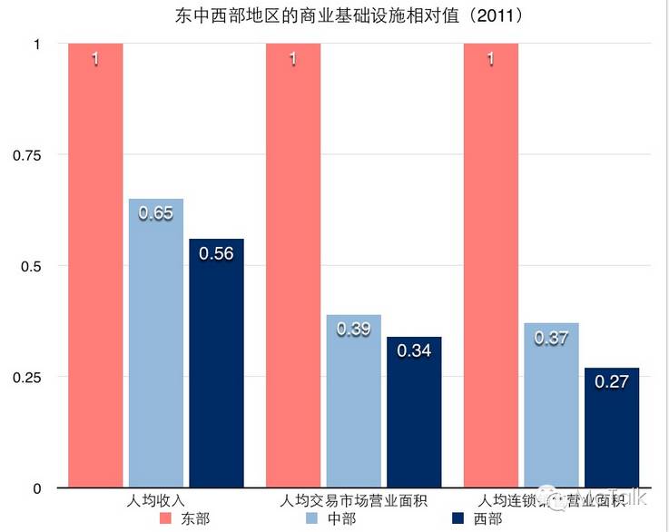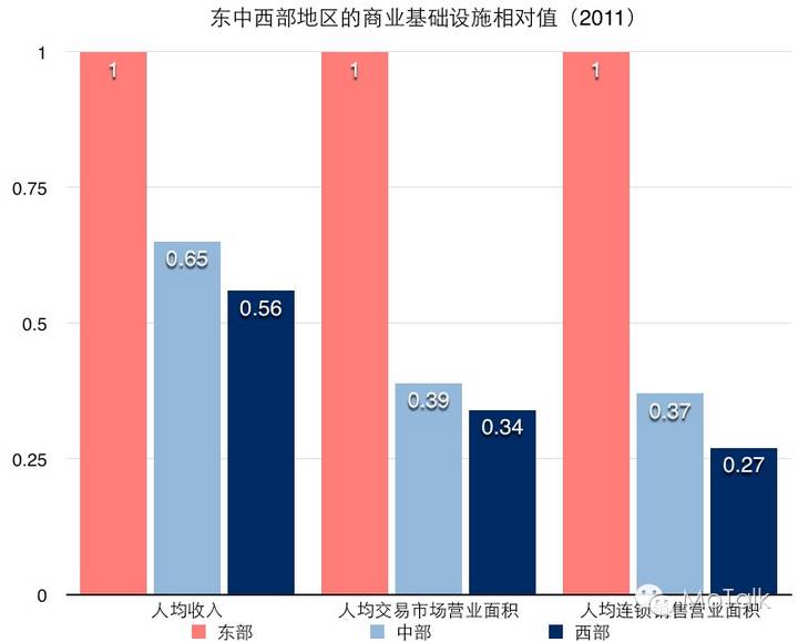 1. 实体批发零售基础设施不均匀:西部人均收入是东部的一半,人均批发零售营业面积只有东部的1/3~1/4