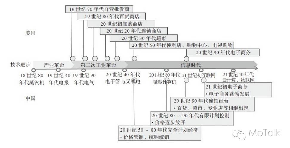 如果这还不够清晰明白,那么我们从历史发展来看看天朝和美国的传统实体零售业和电子商务的发展时间轴对比: