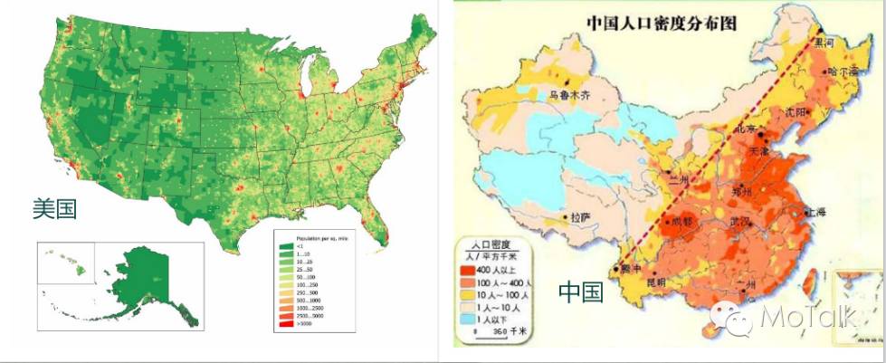 从上图我们看到美国人口的分布密度很分散,而中国地少人多且人口居住相对集中。中国每平方公里平均人口密度为130人,约是世界人口密度的3.3倍,且中国人口分布很不均衡:东部沿海地区人口密集,每平方公里超过400人;中部地区每平方公里为200多人;而西部高原地区人口稀少,每平方公里不足10人。