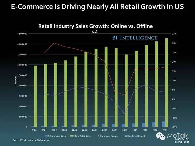 电商?不过是由1995的牙牙学语的孩童变成稚气未脱的青少年,弱小依旧;但是并不是说美国的电子商务发展就缓慢,从图片上我们可以看到:美国电商的增长速度是超过零售业的。但是——然并卵。