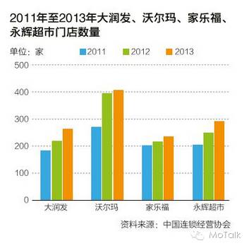从上图我们可以看到跨国零售商在中国的覆盖率更低,世界零售业霸主沃尔玛2013年仅有411家门店。