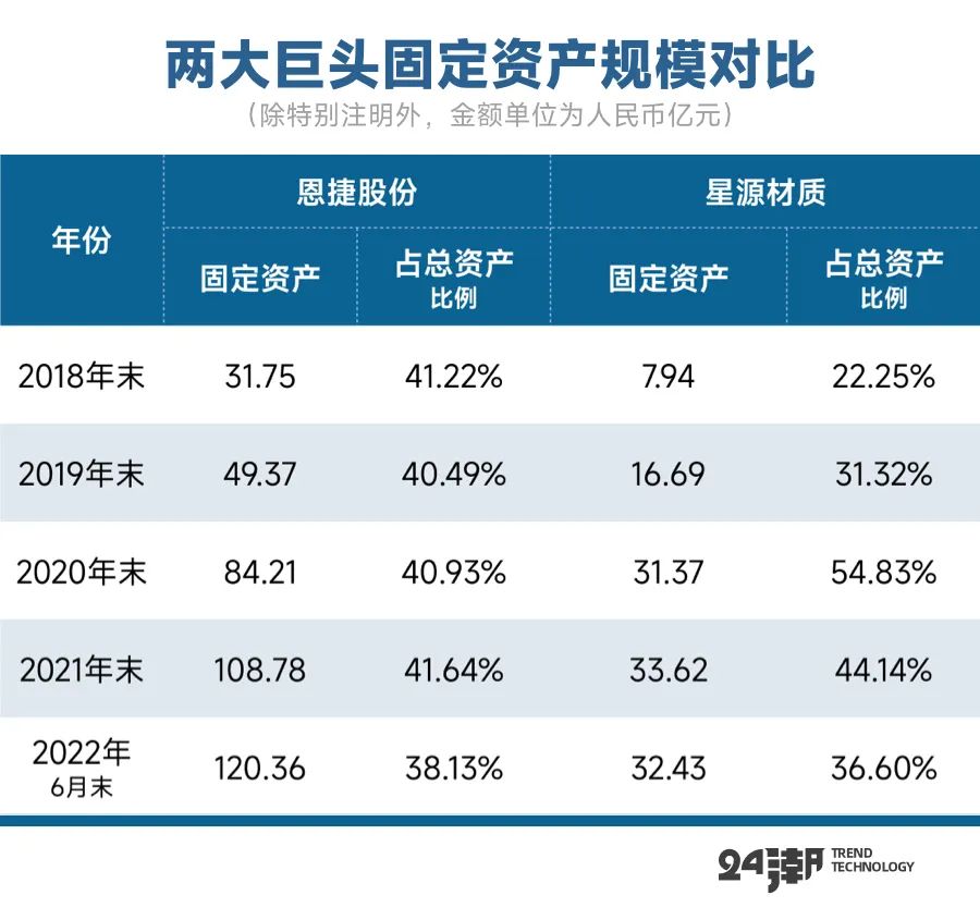 以2022年半年报为列,宁德时代与比亚迪固定资产占总资产的比例分别为12.92%、20.21%。而同期恩捷股份与星源材质固定资产占总资产比例分别为38.13%和36.60%。