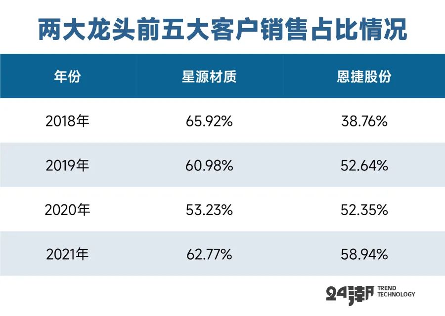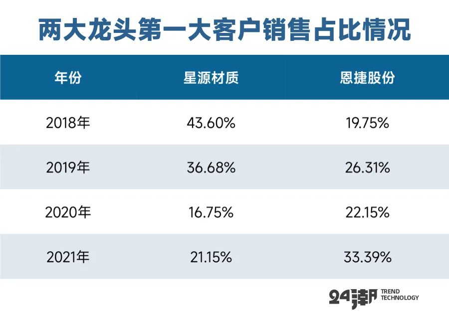 纵观产业发展趋势,笔者发现由于下游动力电池领域已经形成寡头格局,几乎所有锂电池材料供应商普遍存在着 “大客户依赖” 的现象及风险。