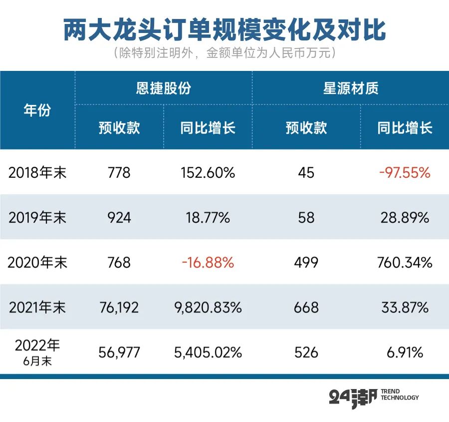 如下表所示,截止2022年6月末恩捷股份合同负债规模为5.70亿元,同比增长了5405.02%,而星源材质合同负债仅为0.05亿元,同比增了6.91%,星源材质合同负债规模仅为恩捷股份的0.92%。